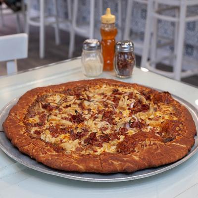 The green chile chicken pizza is also popular, which uses a local green chile sauce and includes mozzarella, chicken, fresh jalapeños, diced green pepper, red onion and a Southwestern corn mix.