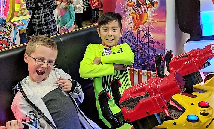 Cherryh's son, Lincoln Butler, 7 (left) with her nephew, Elliot Everett, 11, living it up at Chuck E. Cheese |