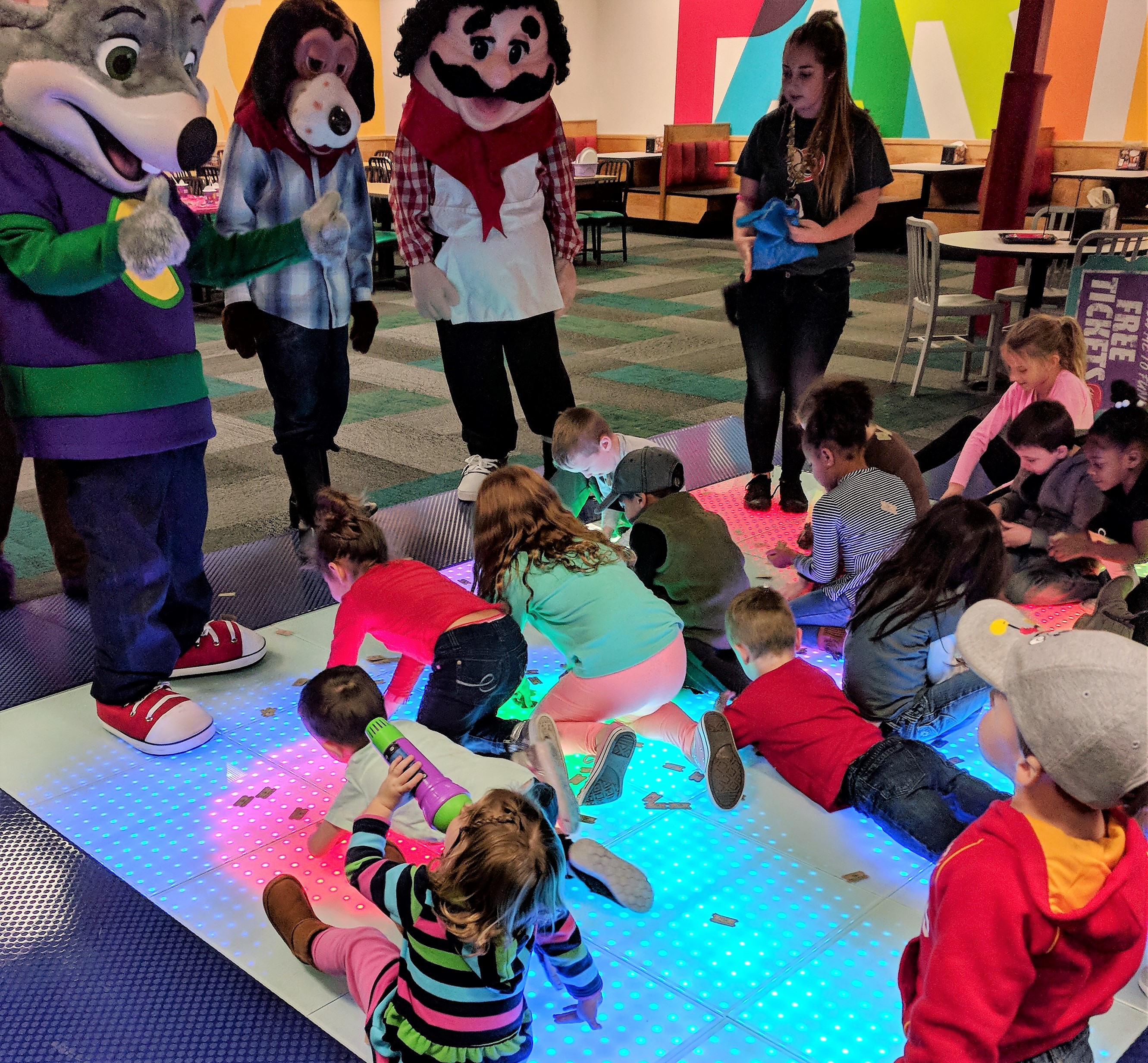 The remodel also features modern seating, kiosk ordering, a programmable "tap-to-play" Play Pass game card system and a light-up dance floor where hourly live shows and birthday shows will take place.