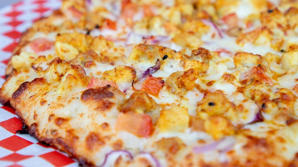 Diners can expect the brand's signature pizzas, appetizers and sides alongside mango lassies and beers on tap. The menu boasts creative pizzas like the Curry Chicken Masala Pizza and the Palak Paneer Pizza, featuring flavors familiar to Indian cuisine. Vegetarian options are plentiful, with pizzas like the Shahi Paneer and Aloo Chaat, alongside classics like Meat Lovers and Hawaiian. Thin, thick, gluten-free and cauliflower crusts are available.
