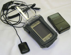 The PiMobile in-car communications package. From left to right is the GPS receiver and recharger cables, the dash-mounted handheld unit, and the belt-mounted magnetic card reader-printer. |