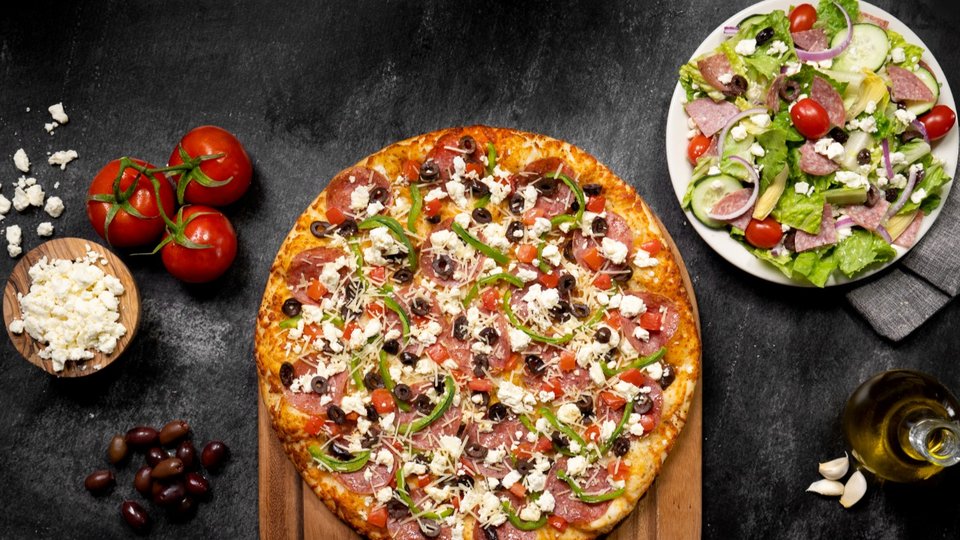 The pizza features Kalamata olives, feta cheese, signature garlic olive oil and seasoning and the chain's three-cheese blend.